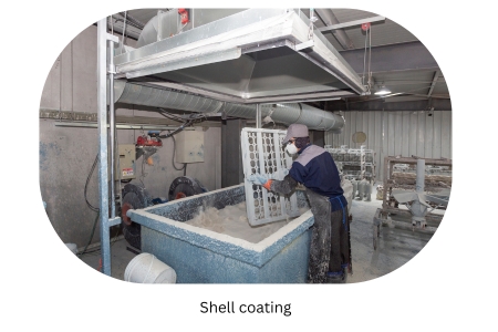After constructing the wax tree and pouring/feeding system, the wax model is dipped into a slurry tank to apply multiple layers of fireproof ceramic. These layers are then allowed to air-harden for added strength.
